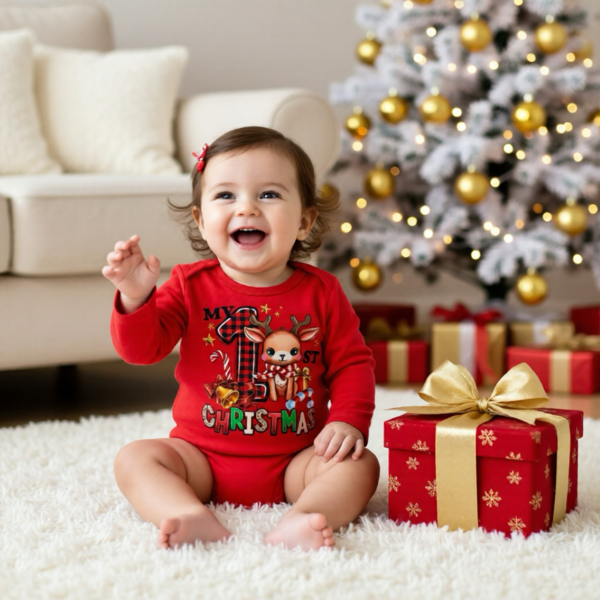 Design: Festive reindeer, presents and "My 1st Christmas" lettering