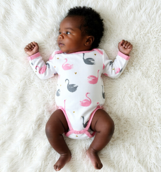 Design: White long sleeve onesie with charming pink and grey swan prints and tiny gold hearts